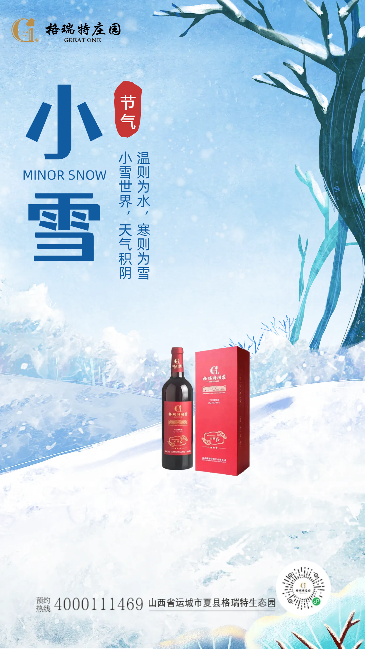 二/十/四/節(jié)/氣 四季有序,萬物有時。伴隨二十四節(jié)氣的時間刻度,格瑞特和您一起慢度時光,把一年四季的詩意風光都融進葡萄酒里,讓您感受每一杯微醺中蘊藏的生命的溫度。 LITTLE SNOW TERM 露凝霜重漸傾欹,宴賞才過小雪時。 蒂有余香金淡泊,枝無全葉翠離披。 寒風掃過葡萄莊園,葉片紛紛飄落。大地封凍之時,我們迎來了小雪。 小雪之美,是寂寥、靜和、幽寒,是一切歸于樸素和平淡之后,消散了年少時的輕狂與愁容,讓人靜下來思索得失,整理一年里的蘊藏。 清晨的格瑞特莊園濾去了雜亂與繁瑣,帶來廣袤和清醒,陽光透過稀薄的云層,散落在大地上,微弱而溫暖。站在晨光中的小草木,臨風而立,骨子里透著不畏嚴寒的堅強。 霜打殘枝,風卷落葉。葡萄園里,只余黃綠交雜的葉,在風中沙沙私語。葡萄老藤有生命力地不斷向下扎根,向上生長,經(jīng)過了冗長歲月的沉淀和歷練,像是深諳世事的老人,滄桑中帶著睿智。 冷風吹過,吹散天地間的云朵,留下一抹藍天,如此清澈,如此寧靜??蓯鄣穆槿冈陔娋€桿上嘰嘰喳喳,與藍天相互映襯,成了獨特的冬之景。 美好的事物大多是可遇而不可求,是剛剛好的天時地利人和,正如格瑞特葡萄酒,精妙詮釋“天地人和,佳釀自成”的獨特風味。